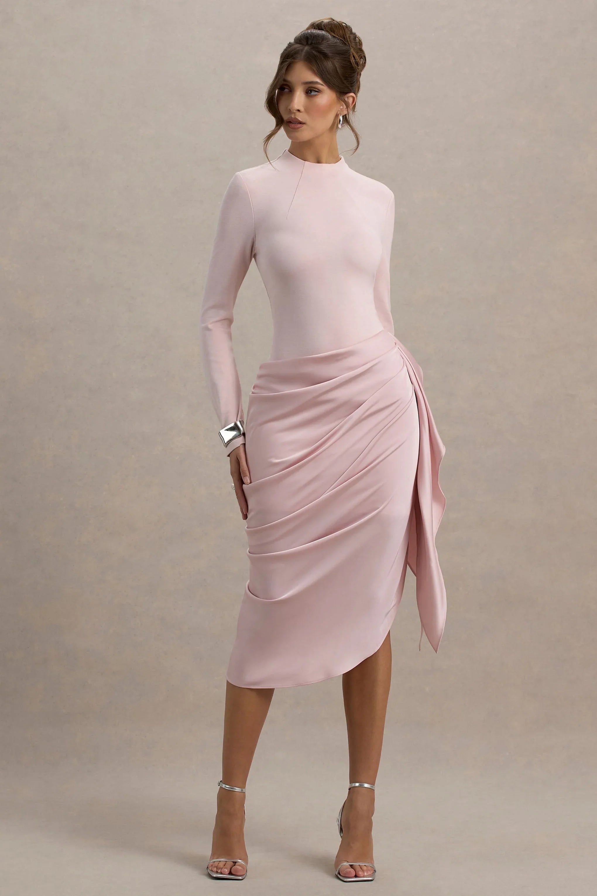 Meet your new go-to statement piece, our Raffie midi dress. Designed to sculpt and flatter, this dress is crafted from our premium ponte fabric with a satin wrap skirt, in a delicate shade of pink. Featuring a crew neckline and long sleeves for sophisticated structure, that contrasts perfectly with the the skirt that drapes effortlessly for an elegant finish. The asymmetric hemline adds a modern touch, making this the ultimate occasion-ready look. Pair with sleek accessories for a show-stopping ensemble