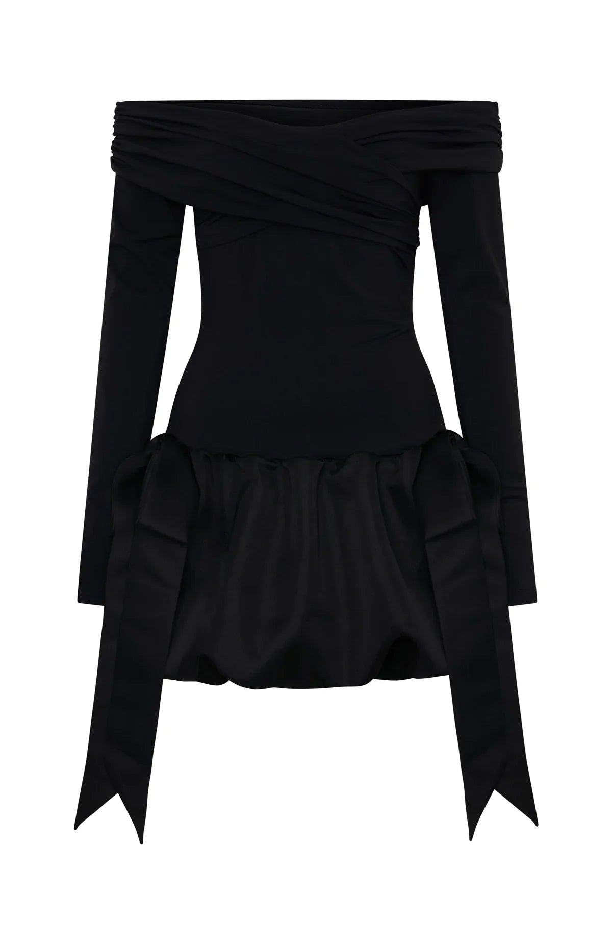 Totally sleigh your fit in the Raise Hell Long Sleeve Mini Dress in Black! Features an off-the-shoulder neckline with a chic fold-over detail, elegantly draped over long sleeves. The fitted bodice hugs your shape before falling into a playful drop-waist bubble skirt finished with a statement bow. Fully lined for comfort. Style it with sky-high heels and eye-catching jewellery for your next xmas event.
