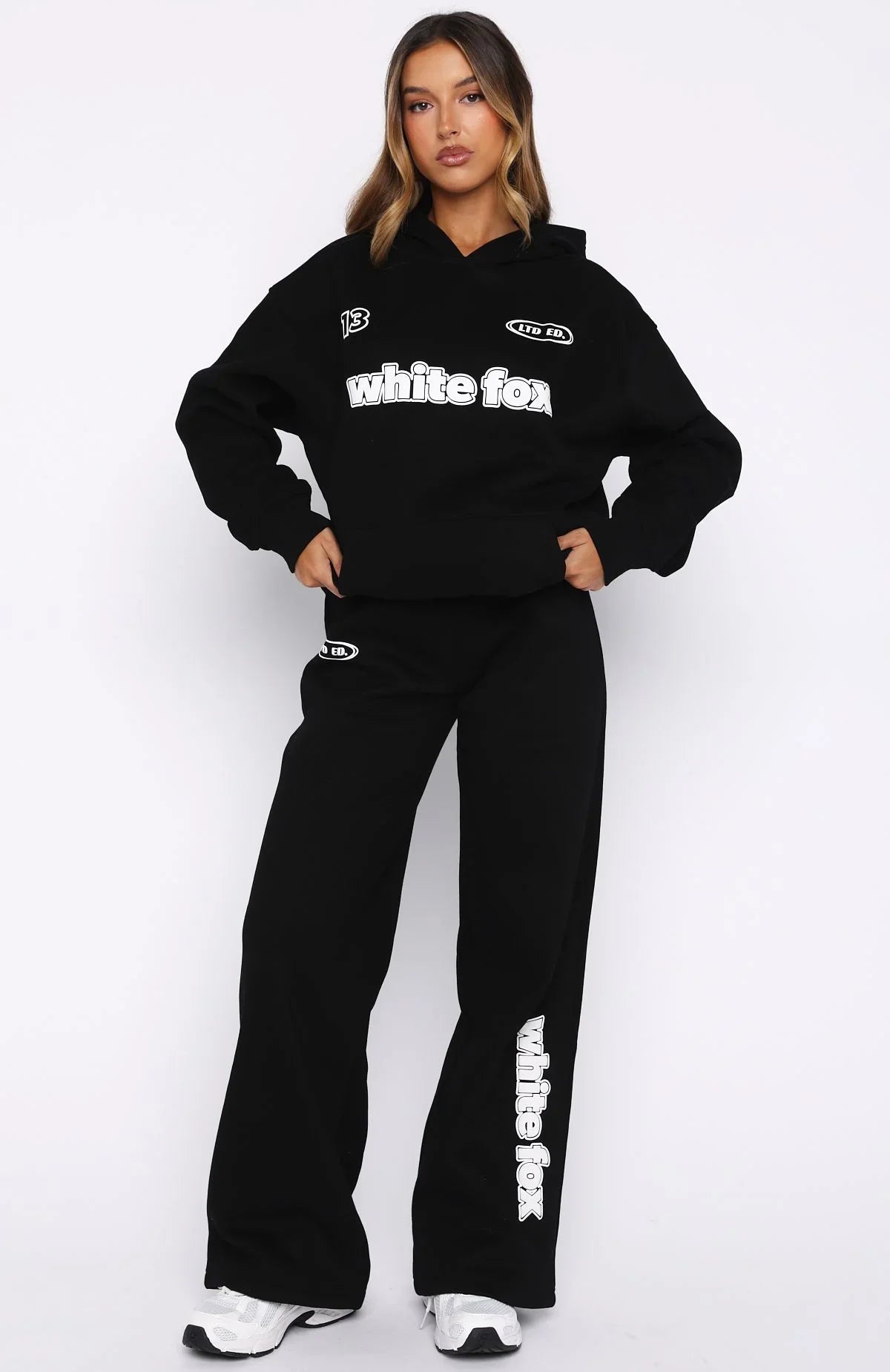 Studying has never looked cuter in the Ready To Go Oversized Hoodie in Black! Features a hood, slouched shoulders, long sleeve with ribbed cuffs, ribbed hemline, softest fleece lining and signature puff print White Fox text and graphic centre front. Complete the look with the matching You're Not Allowed Wide Leg Sweatpants Black.