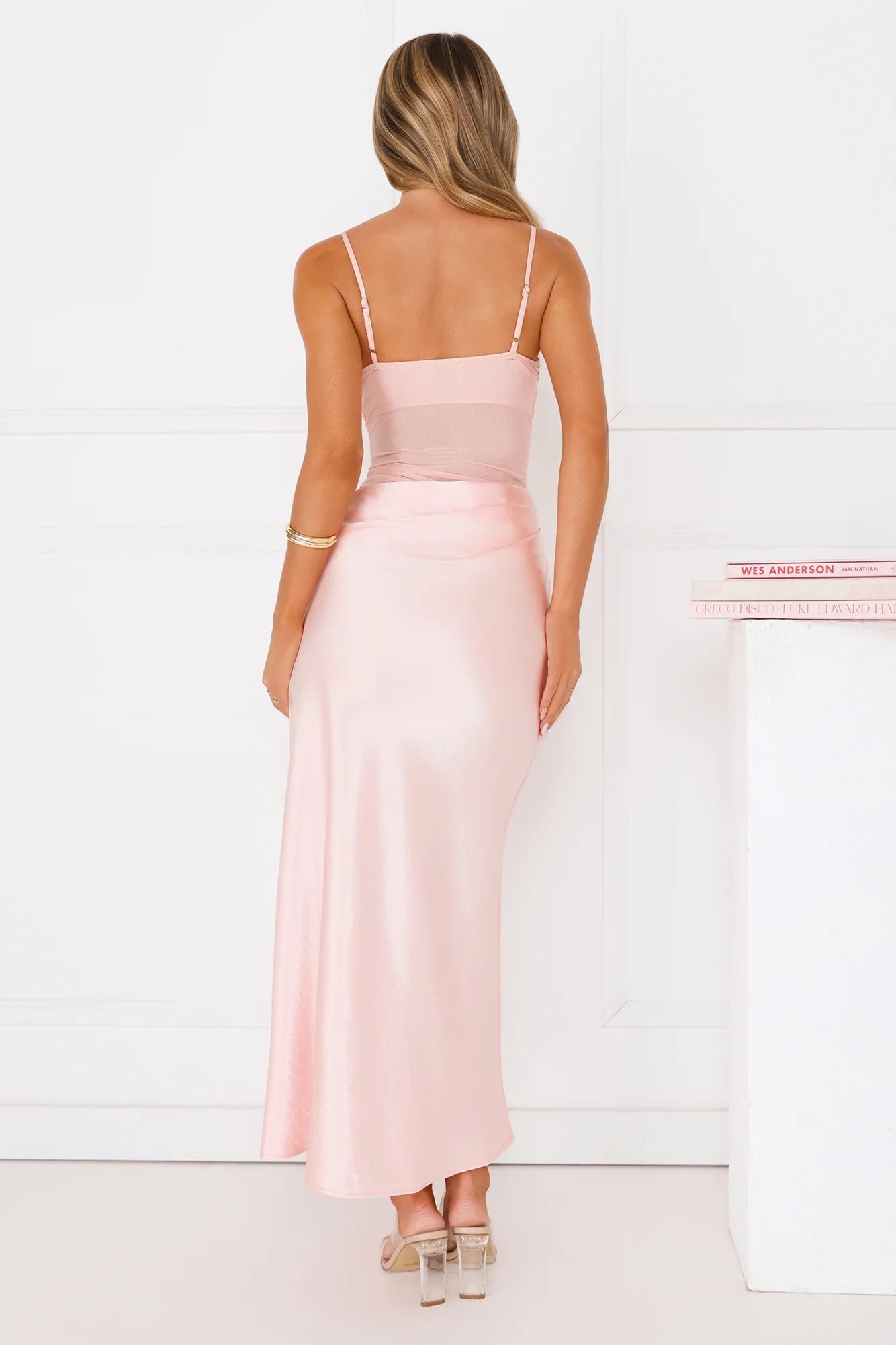 The Rule The Glow Satin Mesh Maxi Dress is your go-to for effortless charm, featuring a mesh top with a cutout to the waist and a silky skirt. Style with heels.