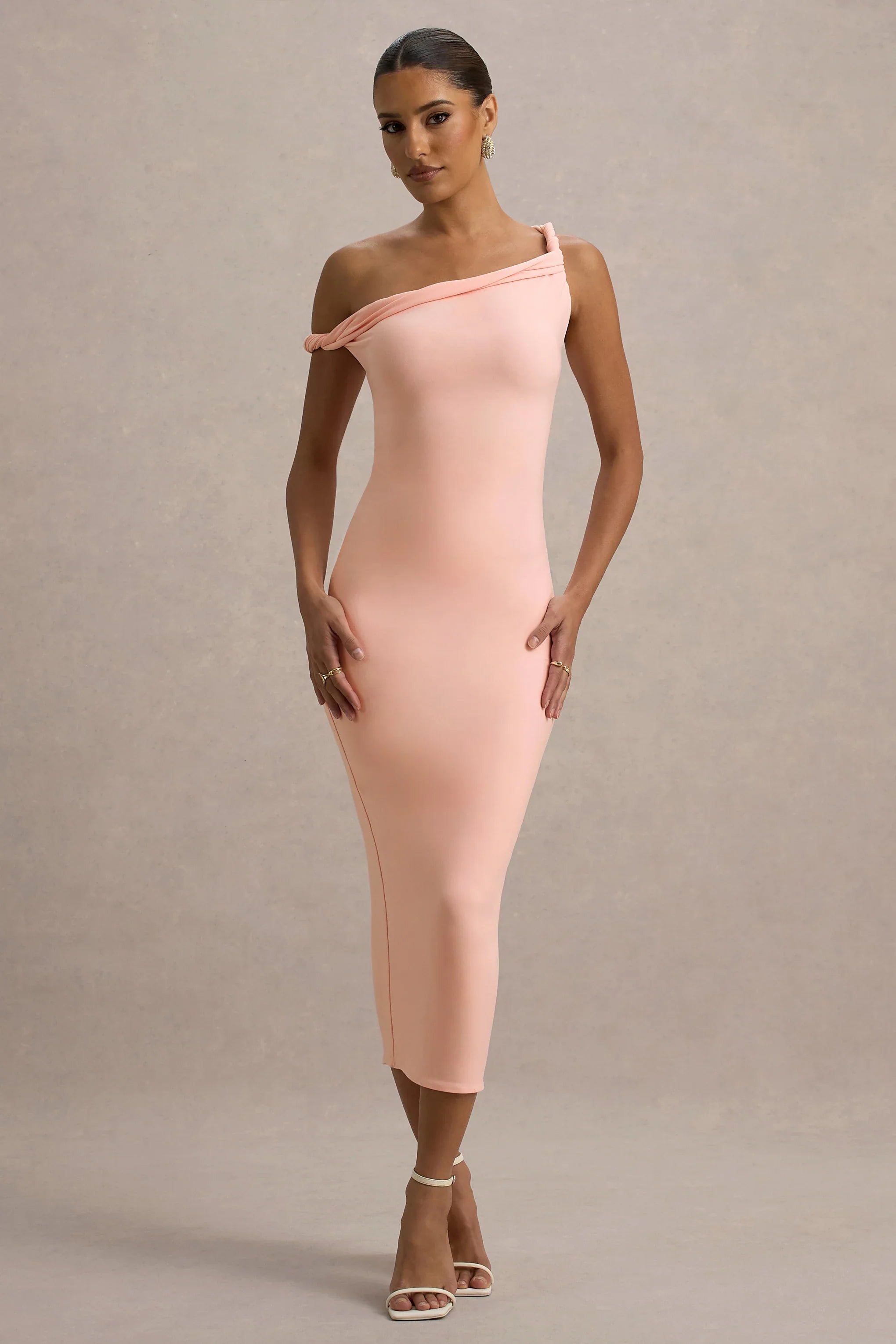 Minimalistic with a twist, say hello to Salome. This midi dress in pink has been crafted in our premium brushed jersey for figure-flattering comfort. Detailed with an asymmetric twisted neckline for a new season shape, keep Salome at the forefront with a sleek updo and gold accents.