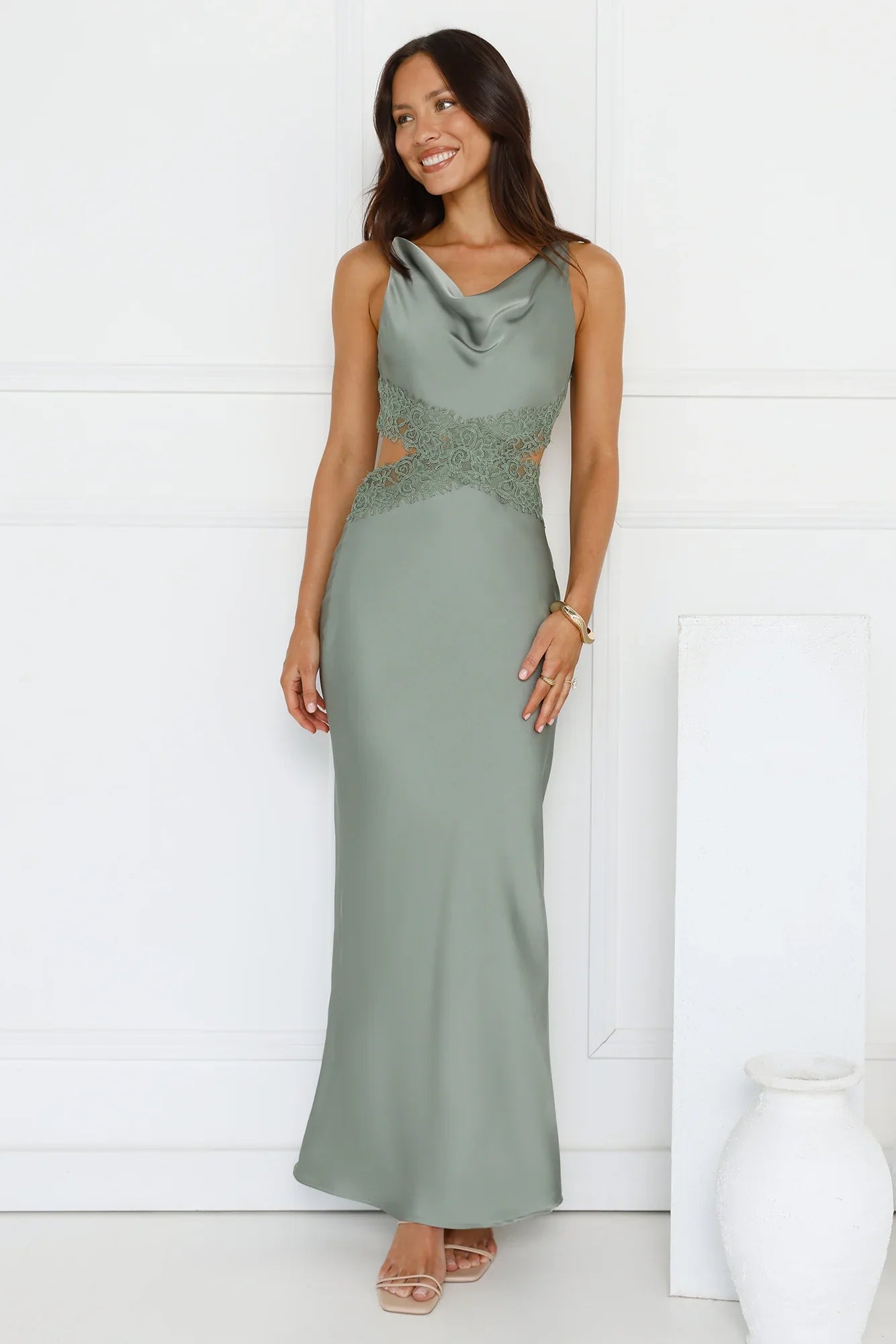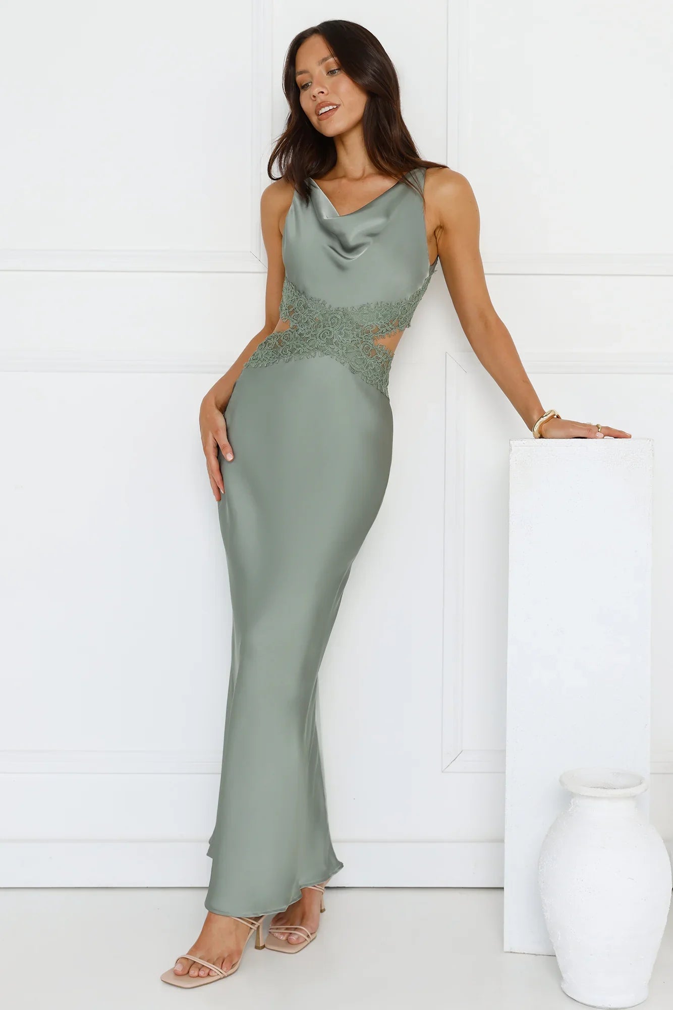 Embrace effortless elegance in the Satin Embrace Maxi Dress, featuring a silky satin silhouette, a waist cutout with lace trimming and a gorgeous open back with ties! Style with heels.