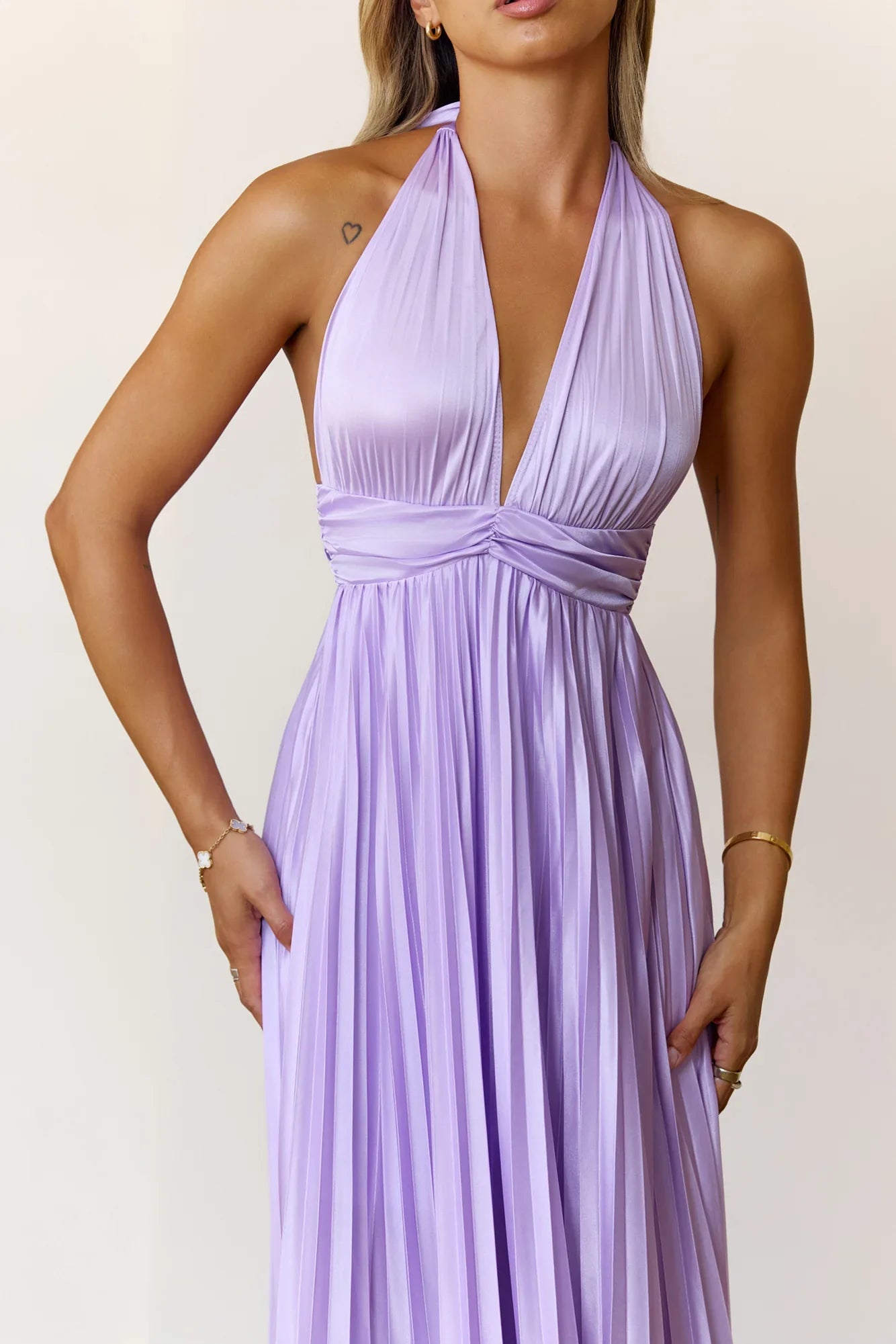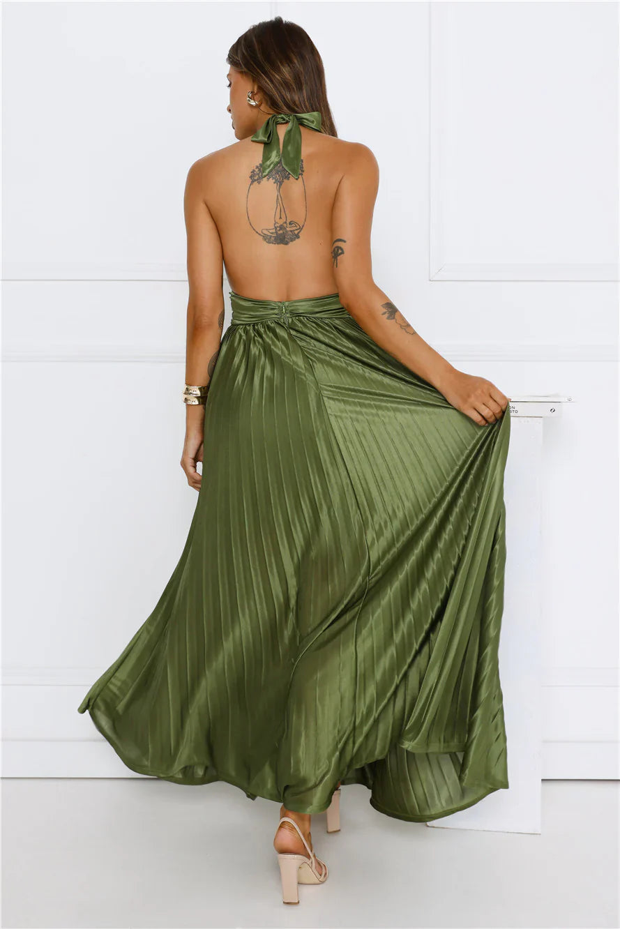 Enter in a dreamy style, lovely! The Shimmering Sea Pleated Halter Maxi Dress features a gorgeous silky silhouette with pleats and a halter tie. Style with heels for an extravagant 'fit.