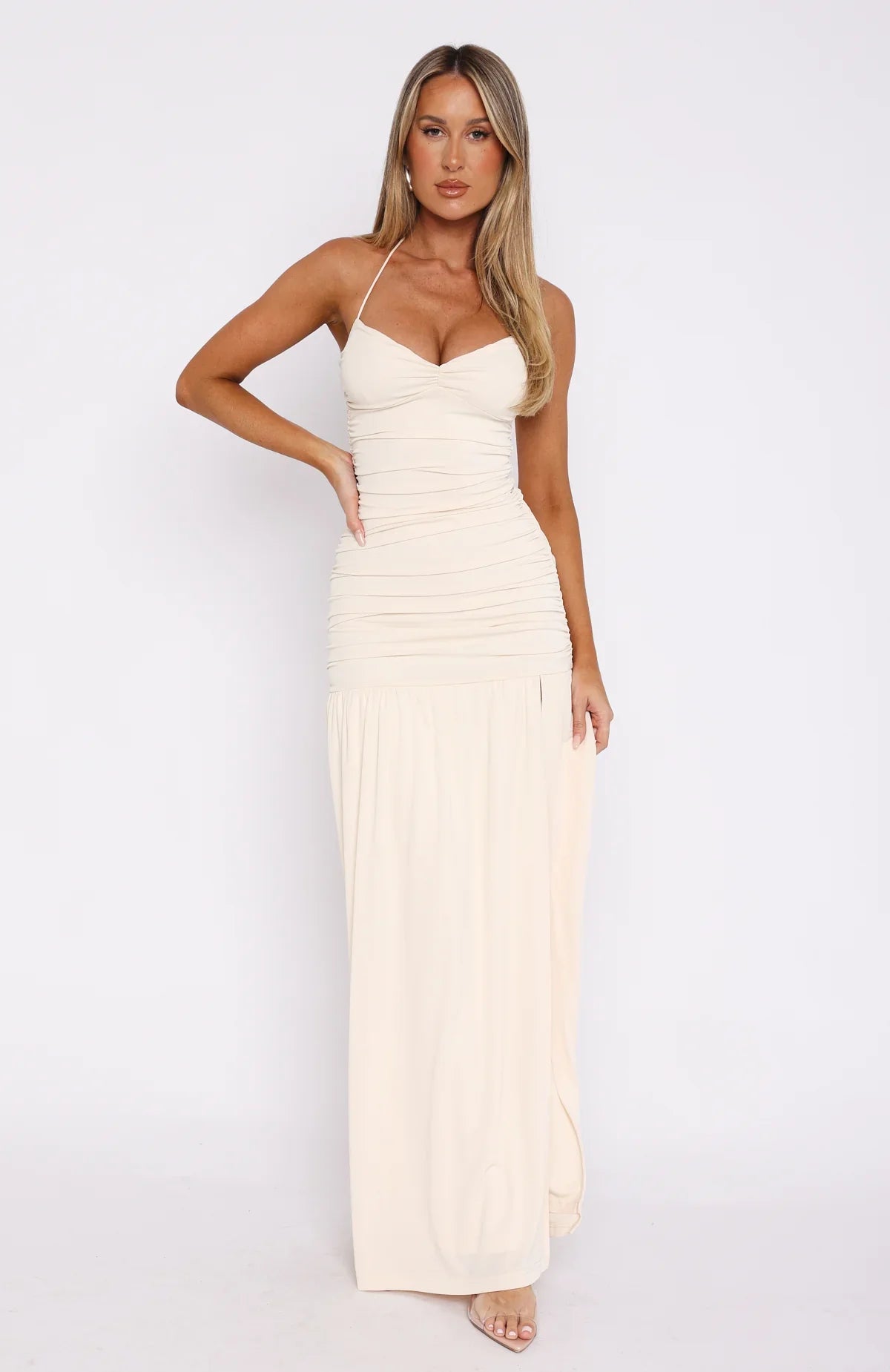 A vacay dream! The Sweet Skies Maxi Dress Cream features a halter style neckline with thin self-tie straps, low cut neckline, front ruched bust detail and dress bodice, hugging silhouette, maxi drop skirt with high cut split hem design, lined fabric, and stretch for a slip on design. Pair with kitten heels and simple accessories to let the dress do all the talking.
