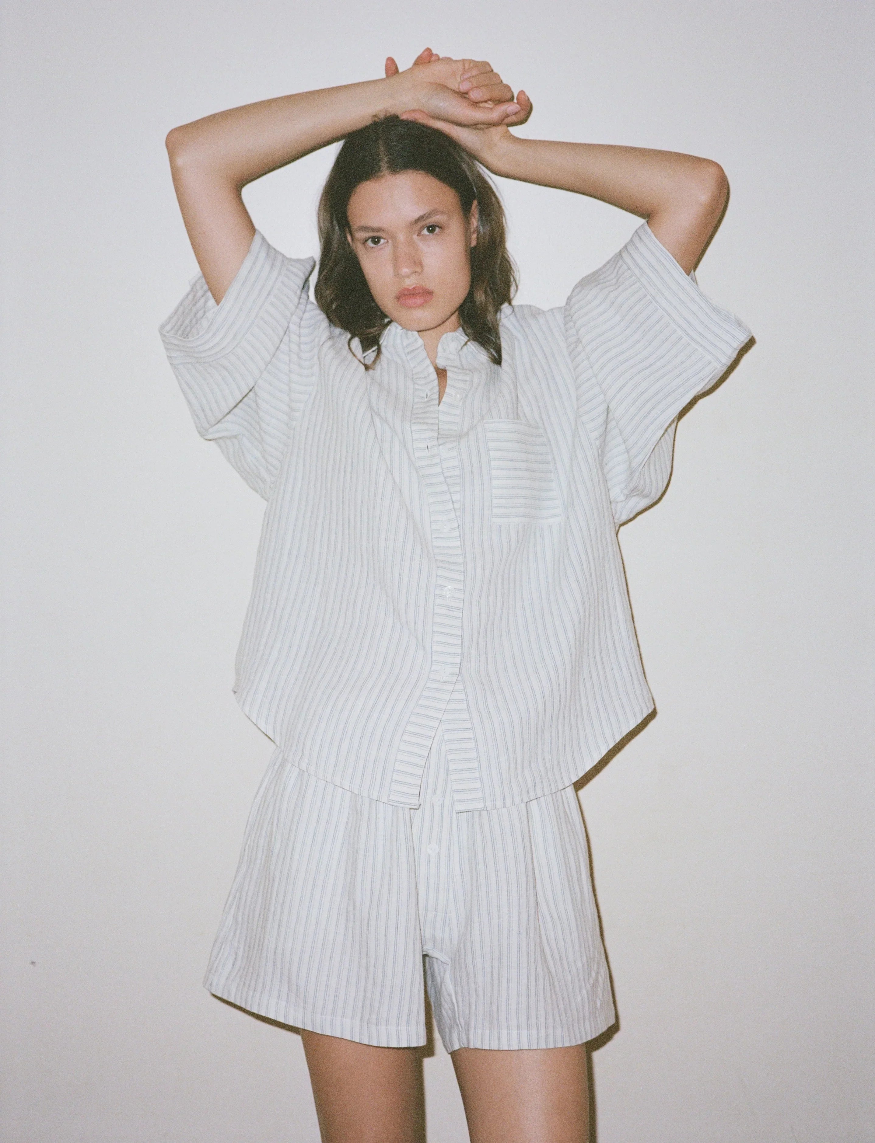 features an oversized box fit linen shirt with wide arms and a front pocket