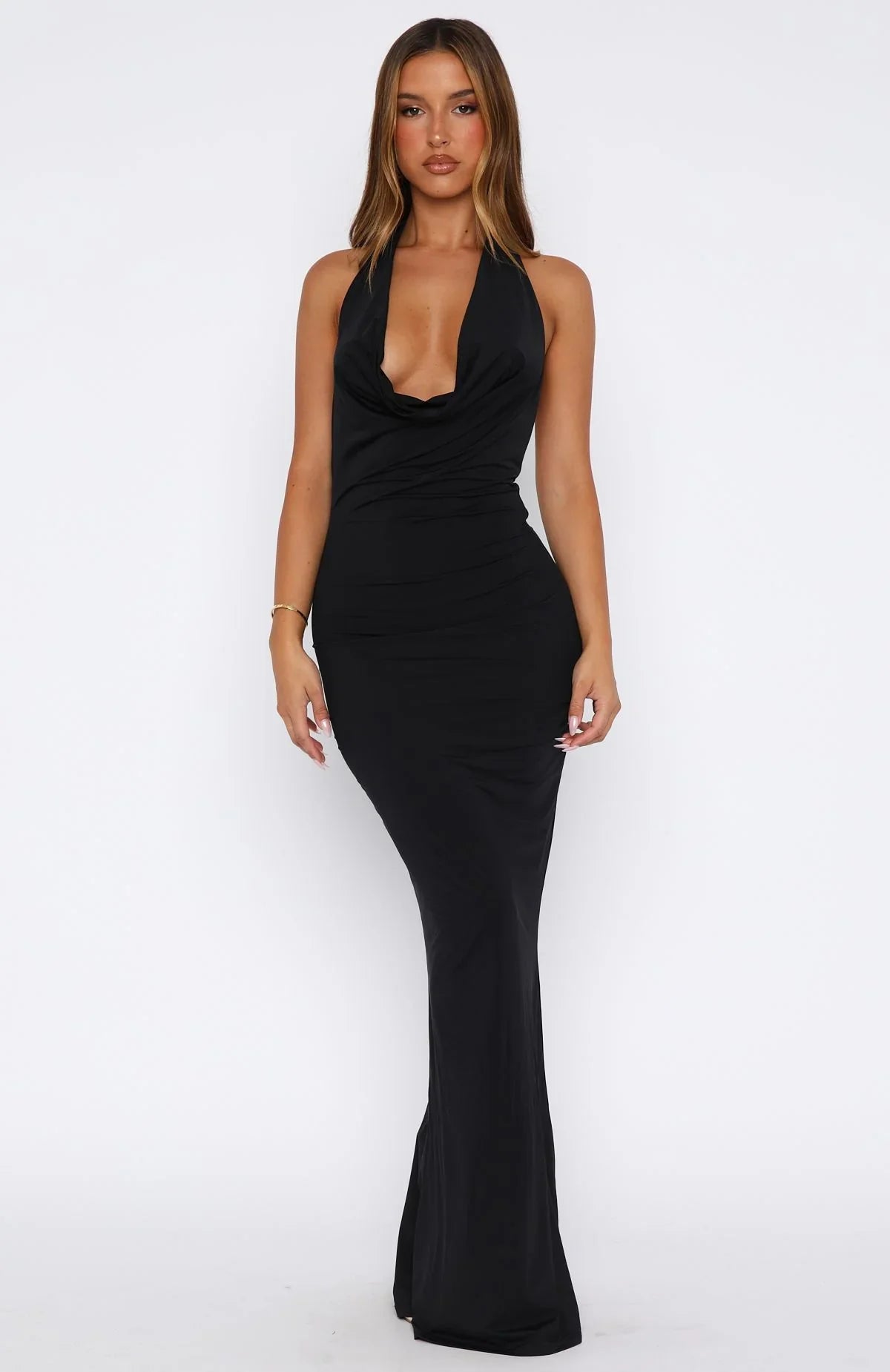 She's Euro Summer ready in the Vacation Time Maxi Dress Black. Features a plunge neckline, halter neck style straps with back tie-up straps, sheer lining, backless, plunge neckline, maxi length and gorgeous printed fabric! Stand out at your next event and pair it with a mini bag and show off your look!