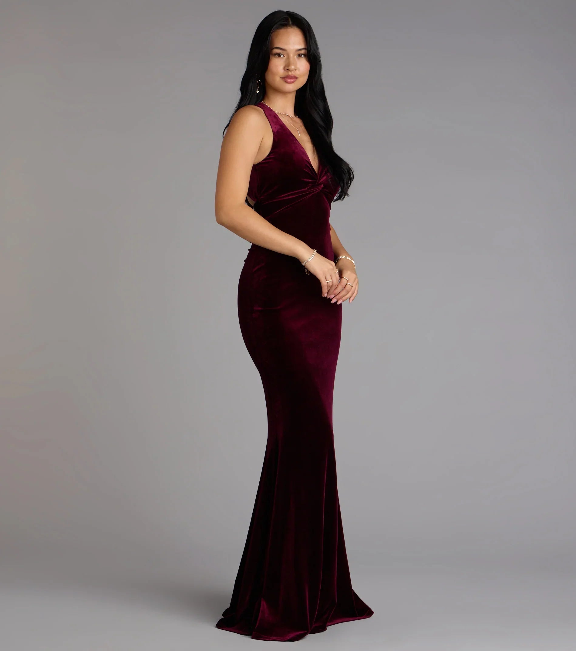 Classic elegance meets modern allure in the Vivienne velvet gown, designed with a plunging halter neckline and an open back tied in a dramatic bow. The floor-grazing silhouette makes every entrance feel effortlessly glamorous.