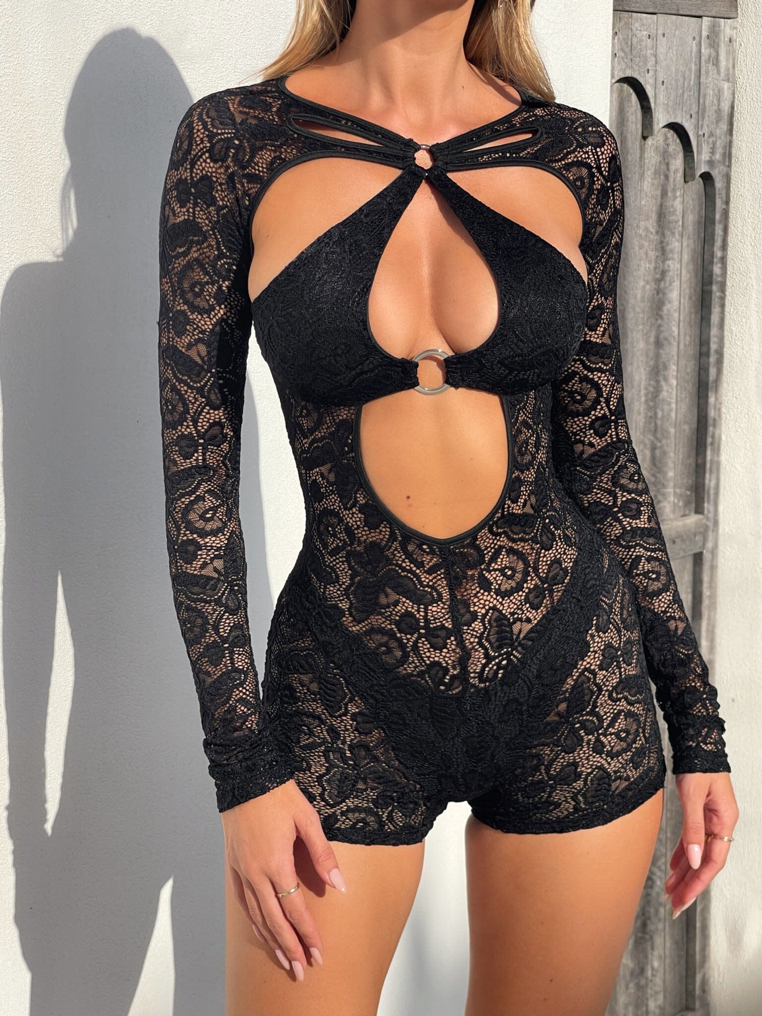 Crafted from a sheer floral lace fabrication, Zoe comes with and undergarment for convenience and is lined at the bust for extra support. She is designed with cut-outs throughout the body that add intricacy to the design, detailed with silver ‘O’ rings that add a touch of edge. She is complete with long sleeves and an open back with a clasp closure that provides extra security!